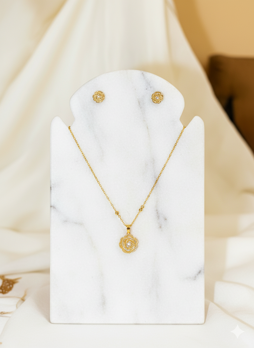 Cadena con pendiente y pantallas con diseño de flor de acero inoxidable en tono oro combina durabilidad y estilo. Accesorio casual y elegante. Perfecta para uso diario, resiste al agua manteniendo su brillo y acabado impecable.